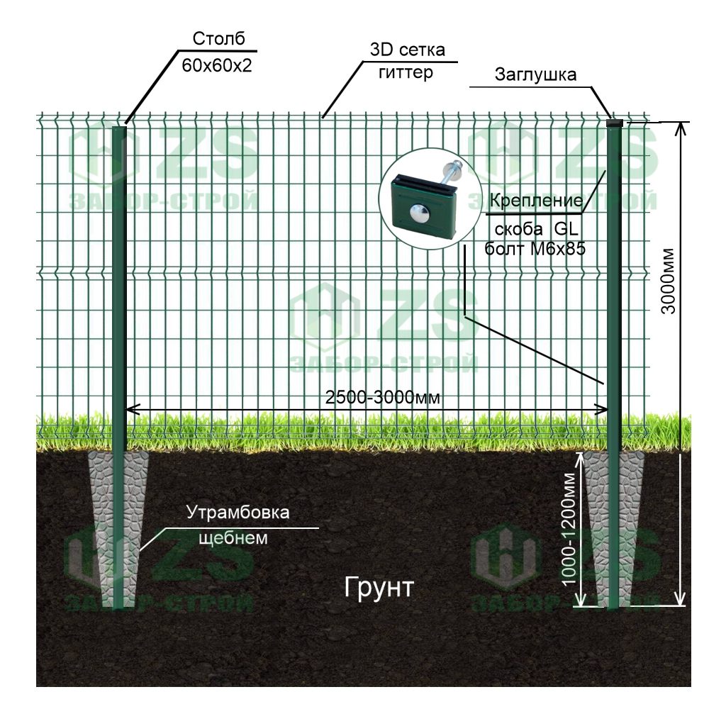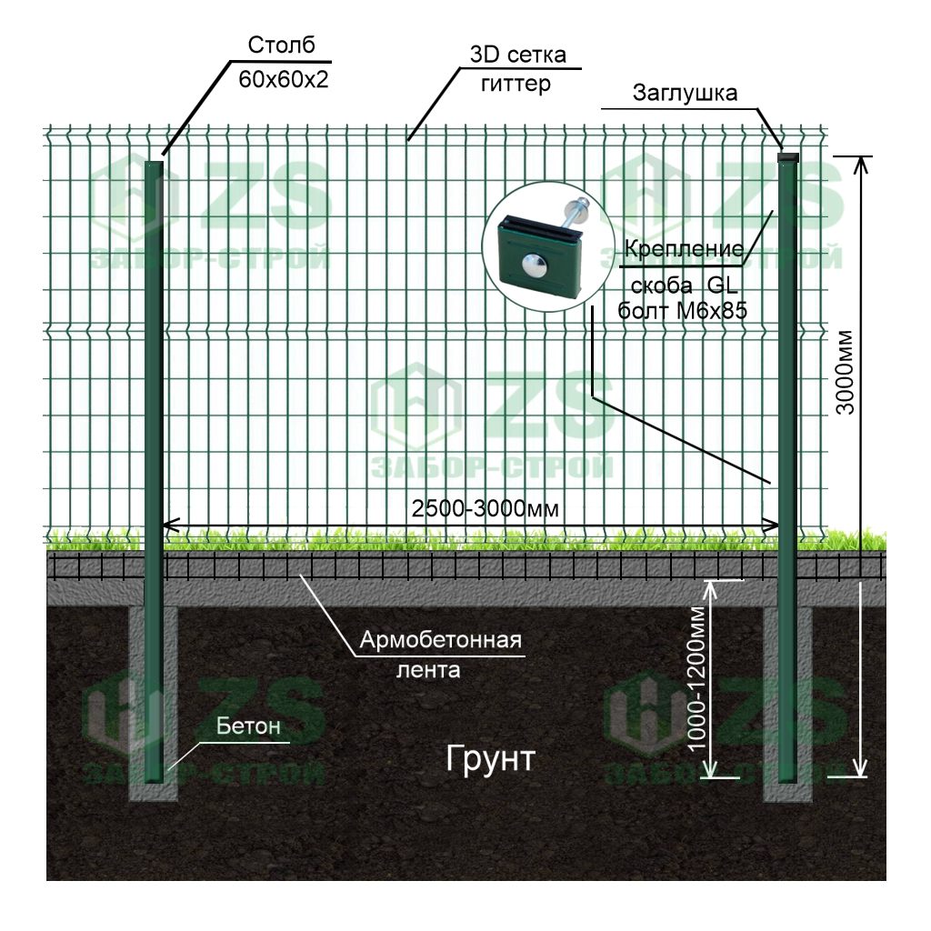 Конструкция забора из 3Д панелей с бетонирование столбов: